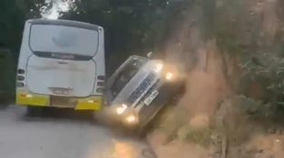 ब्राजील में एक एसयूवी के साथ पर्यटकों का एक समूह, खड़ी बस के बगल में सड़क पार करने की कोशिश करता है.