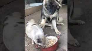 एक कुत्ता एक सुअर का पीछा करने की कोशिश करता है जो खाने के बर्तन पर लालच से खाता है.