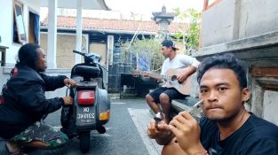 इंडोनेशिया के बाली में पुरुषों का एक समूह, टक्कर पर एक वेस्पा मोटरसाइकिल का उपयोग कर संगीत का एक टुकड़ा खेलते हैं.