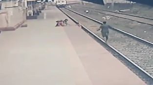 एक रेलवे कर्मचारी एक बच्चे को एक गुजरती ट्रेन से बचाता है