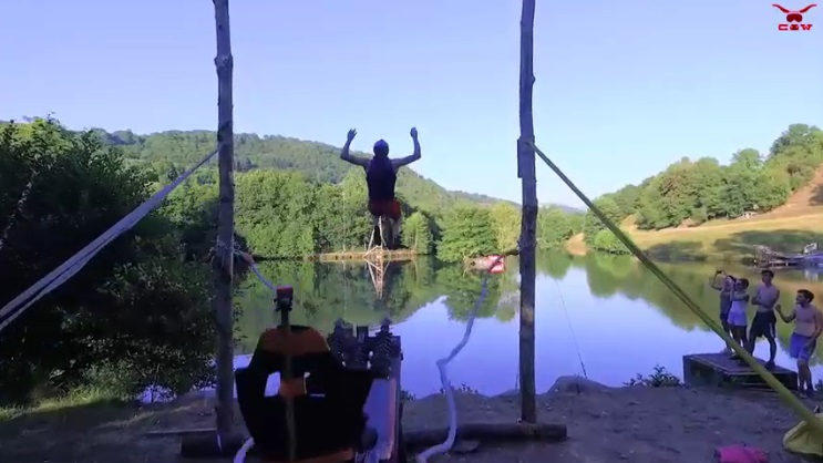 A francia 'RadCow' extrém sportcsapat hatalmas emberi számszeríjat épített egy tó partján. A berendezés kiadja egy atom hosszúságú 15m, A gyorsulás 0-50 km / h-ra 0,9 másodperc alatt.