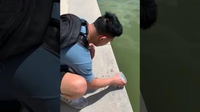 Egy férfi szállít kis állat teknősök egy tóban. Sajnos a sügér lappangó és azonnal megragad a kis teknős, amely csak a tapasztalat néhány másodpercig szabadság.