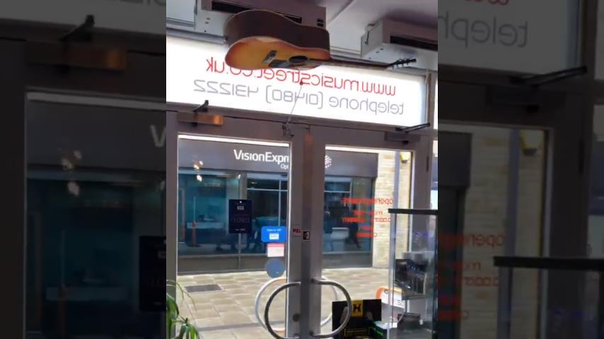 A hangszerek Music Street tárolni Cambridgeshire, England, A bejárati ajtó megüti a gitárhúrunk amikor kinyitja.