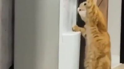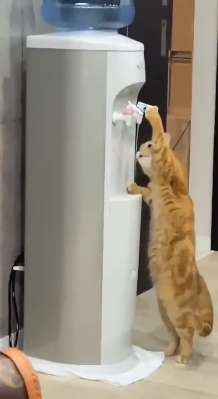 Egy macska az irodai vízhűtővel oltja szomját.