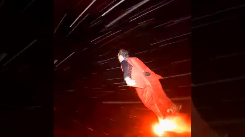 A magas magasságból ugró, szárnyas ruhát viselő férfi látványos ugrása, teljes sötétségben. Az egyetlen fény, amelyet használ, a lábához kötött fáklyától származik.