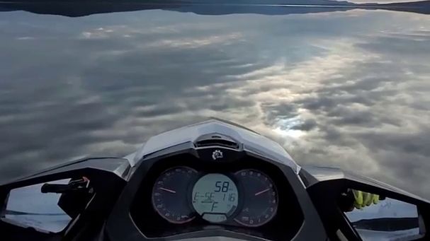 A tó tökéletesen sík és mozdulatlan vízfelülete, azt a benyomást kelti, hogy a rajta lévő jetski mozdulatlan.