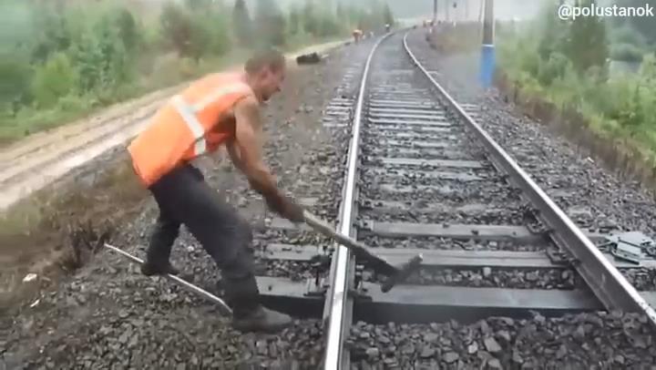 Az a precizitás, amellyel a vasutasok az új síneket a talpfákhoz szögezik (áthalad).