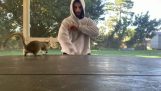 Egy macska és egy kutya nézzen meg egy mókusot a TV előtt.