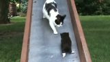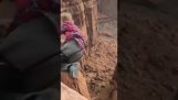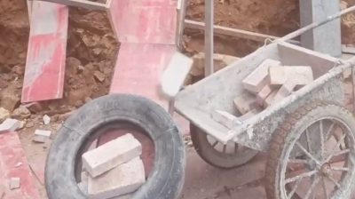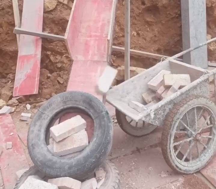Egy építkezésen, A munkavállalók egy rendszert fejlesztettek ki a téglák betöltésére a babakocsiba fárasztó nélkül. A csúszdán gördülő téglák, Gumiabroncs és leszállása egy babakocsiban.