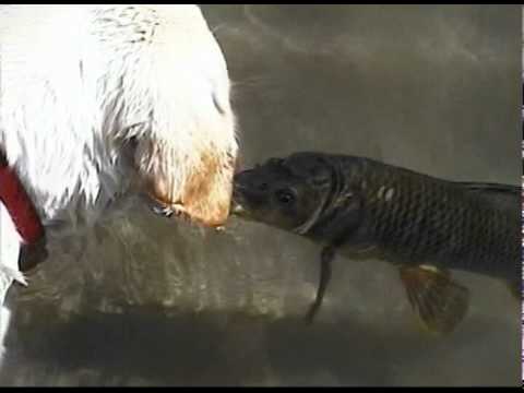 A Labrador úszik, és játszik a ponty.