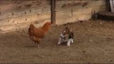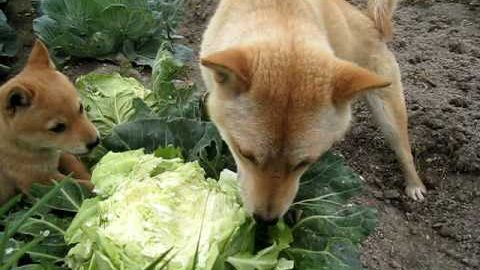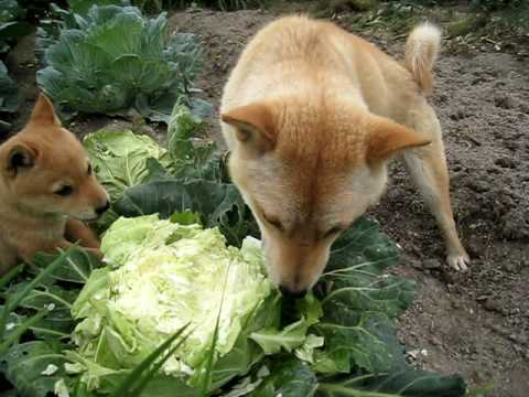 Két kutya-shiba inu tenyészt élvezze a káposzta, a kertben