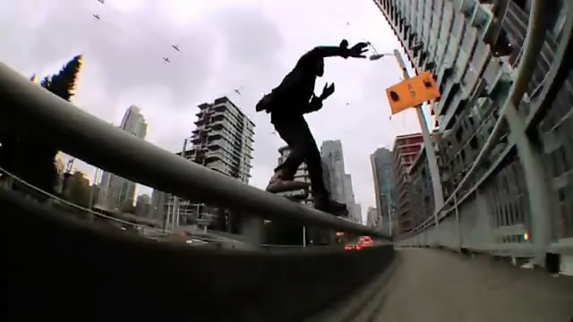 A kanadai Richie Eisler csinál őrült trükkök, görkorcsolya, az utcán a Vancouver.