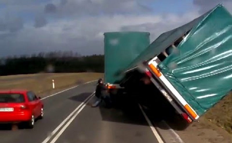 Az erős szél topples üres pótkocsi egy teherautó, Oroszország, és a vezető kétségbeesetten kéri, segítség. Szerencsére, több jó Samaritans az utcán, rohanó swsoyin állapotban.
