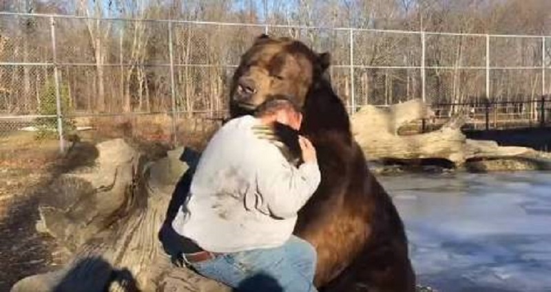 A Jim Kowalczik, gondozó Orphaned kicsapongó élet szentély Wildlife Center ostbil, New York, Djibo játszik, Hatalmas Kodiak medve súlya 635 kg.
