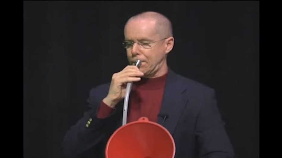 Egy ember, egy szopóka nélkül-a csatorna és a PVC tömlő csatlakozás. Fúj a fúvókát a, létrehoz néhány nagyon furcsa hangok.