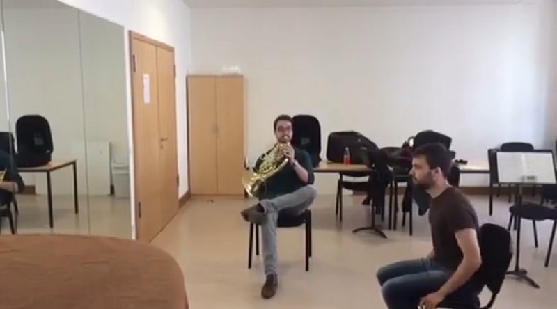Az egyik hallgató játszik egy francia kürt, és egy másik diák egy székre rajzolt a földre kíséri. Egy szórakoztató videó zene Hochschule für Musik diákok iskolai Saar, Saarbrücken, Németország.