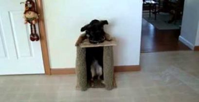 Ez a kutya egy ritka betegségben szenvedő (veleszületett megaesophagus) amelyben a nyelőcső, a kibővített és nem tudja nyomni az élelmiszer a gyomorban. Ezért meg kell enni állt.