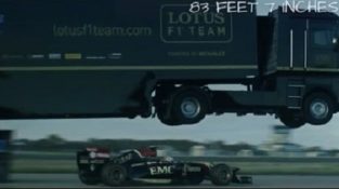 Egy nagy teherautó Renault átugrani egy Forma 1-es autó egy rámpa. Egy hihetetlen mutatvány/reklám, amely bemutatja a brit Lotus F1-es csapat és az együttműködést [...]