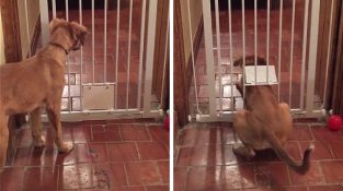 A Das, egy kutya öt hónap, használ akrobatikus képességeit, hogy az áthaladjon egy macska ajtó, a Shrewsbury kutya menedék kutyák Trust, Nagy-Britannia.