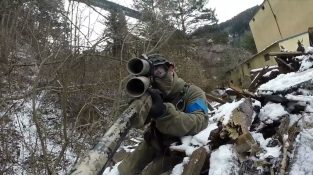 A havas csatatéren, a Airsoft Ausztriában, egy játékos elfogja a harcot a skopeytro, a.