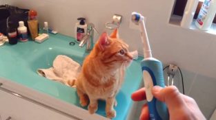 Egy macska amit szeret az elektromos fogkefe. Most, hogy a főnök, a triggerek, a macska a finom masszázs a fejét közelíti.