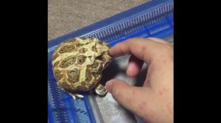 Egy kis béka (Ceratophrys) úgy tűnik, hogy a tulajdonos dühös a. Vicces egy kiderült hogy express a felháborodás és el azáltal, hogy kis ugrással.