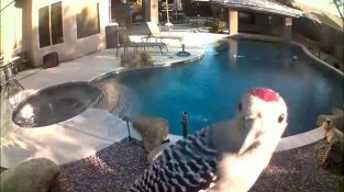 Arizona Egyesült Államok, harkály kopog dühösen lencse egy biztonsági kamera, a ház.