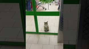A macska vár türelmesen előtt az automata ajtó egy üzlet.