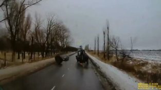 A városban Gubkinsky Oroszország, egy traktor hajtott az úton, amikor hirtelen a kerék le, és hullik elhaladó autó szembejövő.
