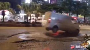 A járművezetők áthaladnak egy nagy vízzel megtöltött pocsolyán egy kínai városban. A járművek nagy magasságban ugrálnak és keményen esnek az aszfalton.