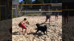 Három férfi és egy kutya játszik egy strandröplabda-mérkőzést.
