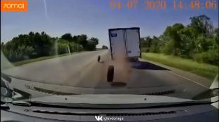Utcán, Oroszország, két kerék elhagyja a teherautó tengelyét. Az egyik kerék az elülső jármű alvája alatt ér véget, ami megbukik.