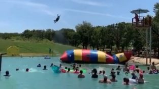A texasi Burger-tónál, egy ember felülről ugrik egy hatalmas felfújható matracra, elindít egy kis gyermeket, amely a másik végén fekszik.