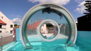 A fóka egy kör alakú akváriumban úszik, amely nincs a vízben, egy uszoda felszínén.