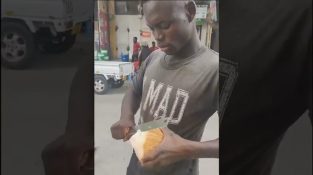 A tanzániai kókuszdió utcai árus friss gyümölcslevet kínál az ügyfeleknek.