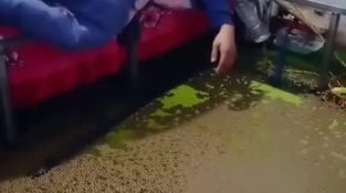 Egy férfi sűrített levegővel próbálja megtisztítani mosogatójának eltömődött szifonját. Végül elég hatékony volt.