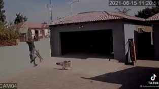 Egy férfi Dél -Afrikában próbál betörni egy házba, de egy pitbull fogadja a hátsó udvarban, és nem engedik el.