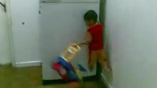 A kisfiú egyik kezével felmászik a hűtőszekrénybe