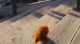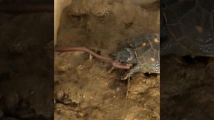 Egy kis teknős elkap egy féreget a szájában, de a féreg nagyon nehéz zsákmánynak bizonyul.