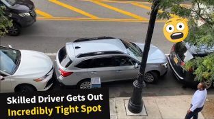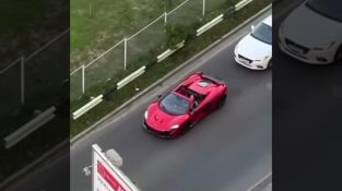 Utcán, Oroszország, a McLaren 620R -el rendelkező sofőr gyorsan mozog, és jobbról próbál megelőzni más autókat.