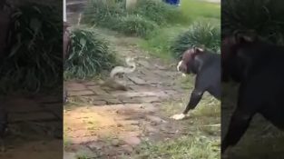 A kertben egy ház, egy kutya szembesül egy kígyóval.