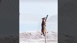 A farkas ügyesen felmászik, és magas szögesdrót kerítést ugrik.