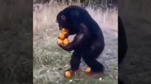Egy csimpánz annyi narancsot hord, amennyit csak tud, a kezében, száj- és körömfájás.