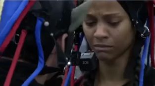 Pillanatkép az Avatar című film forgatásáról, ahol a színészek speciális jelmezeket és eszközöket viselnek, amelyek részletesen rögzítik testük és arcuk mozgását.