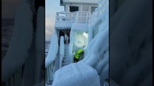 Egy erős vihar elvonulása után, egy oroszországi hajót teljesen beborított egy vastag jégréteg.