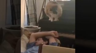 Egy macska megpróbálja átugrani a gazdáját, de nem végez megfelelő számításokat.