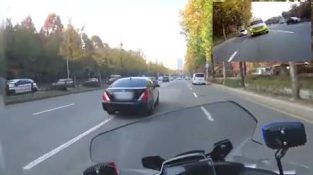 Egy sofőrnek sikerül nagyon veszélyes kanyarodnia egy keskeny úton, egy szikla mentén.