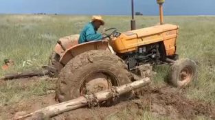 Egy traktor vezetője elakadt a sárban, a famegmunkálási technikát használja járművének kinyitásához. Sajnos a módszer nem a vártnak megfelelően működött.