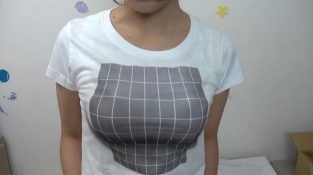 Egy nő olyan pólót visel, ami azt az illúziót kelti, hogy nagy mellei vannak.