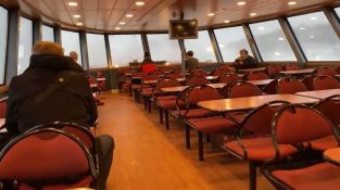 Az Ylenia hurrikán idején 2022. február 17-én, csütörtökön a németországi Hamburg kikötőjében, egy hullám hevesen megütötte egy komp elejét, és betörte az ablakokat.